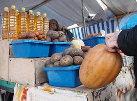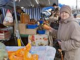 Коптевский колхозный рынок. Покупатели у торговой палатки с овощами. Женщина покупает тыкву.
