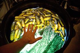 Жанровая фотография. Огурцы соленые в бочке. Рука мужская.