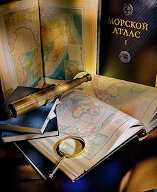 Жанровая фотография. Морской и географический атлас, лупа и подзорная труба.
