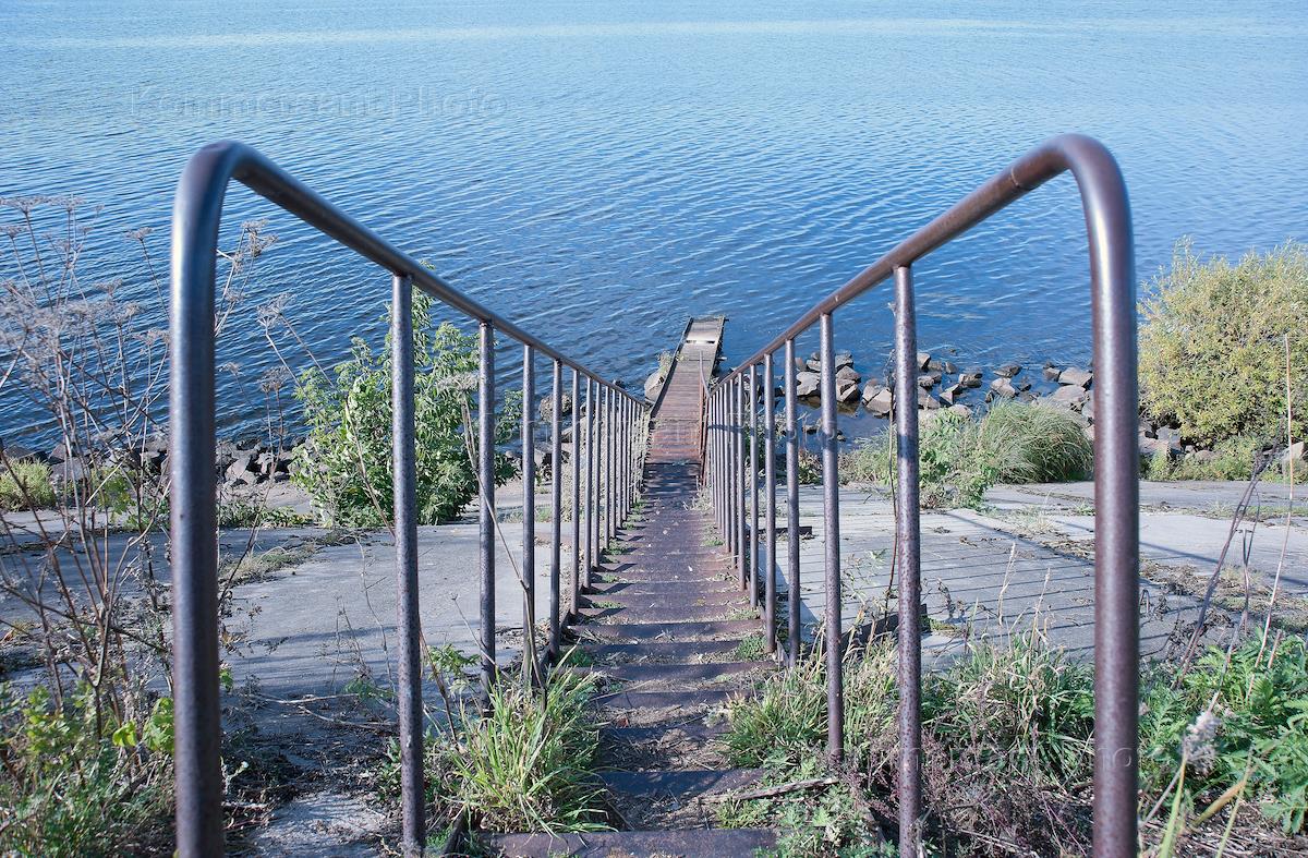 жанровая фотография. Железная лестница и мостик на берегу реки.