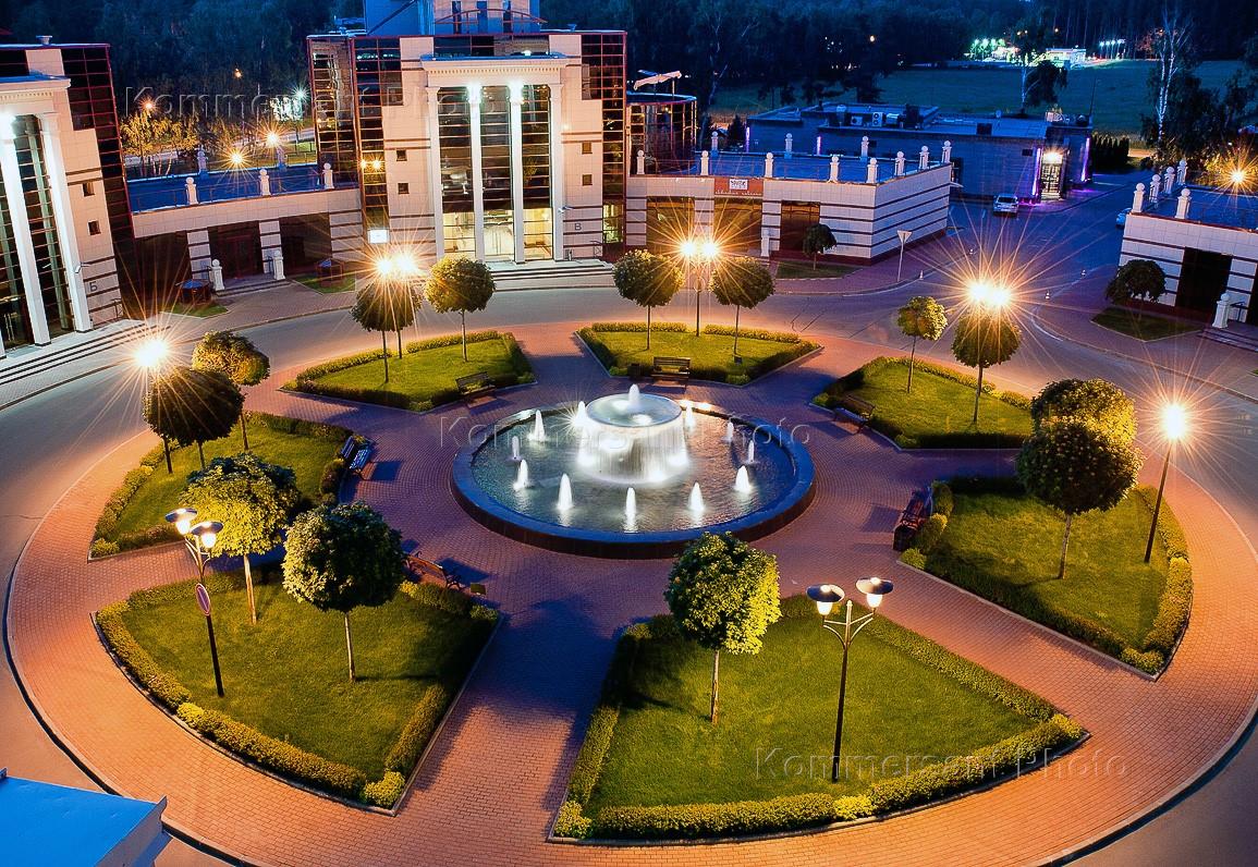 Жанрвоая фотография. Сквер с фонтаном в центре на территории отеля.
