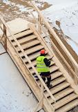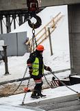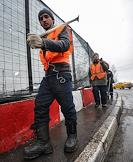 Реконструкция Коптевского путепровода, проходящего над путями Малого кольца Московской железной дороги (МКЖД). Рабочий на строительной полщадки.