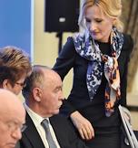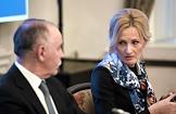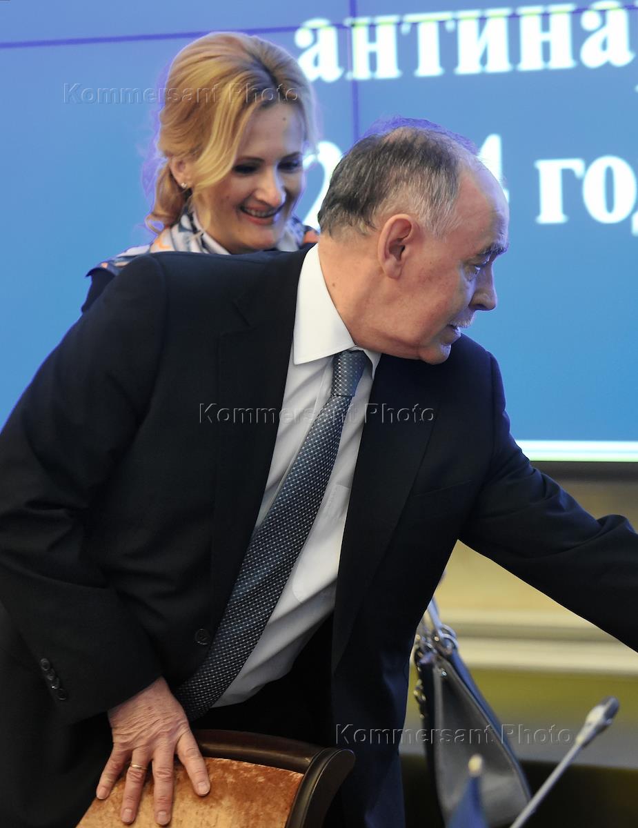 Заседание Общественного совета при Федерации по контролю за оборотом наркотиков (ФСКН) России прошло в здании Общественной палаты России. Руководитель департамента межведомственного взаимодействия ФСКН Ольга Мишина (слева) и руководитель ФСКН Виктор Иванов (справа) во время заседания.