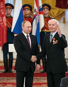 Президент России Владимир Путин (слева) и ветеран Великой Отечественной войны Исрафил Макеев (справа) на церемонии вручения ветеранам Великой Отечественной войны юбилейных медалей "70 лет Победы в Великой Отечественной войне 1941–1945 годов" в Георгиевском зале Большого Кремлевского дворца.