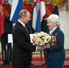 Президент России Владимир Путин (слева) и ветеран Великой Отечественной войны Евдокия Лемаева (справа) на церемонии вручения ветеранам Великой Отечественной войны юбилейных медалей "70 лет Победы в Великой Отечественной войне 1941–1945 годов" в Георгиевском зале Большого Кремлевского дворца.