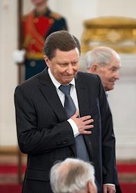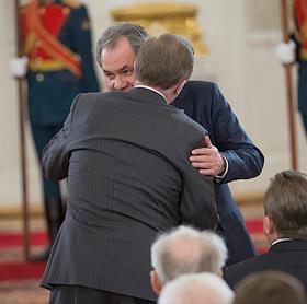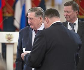 Член Совета Федерации России, председатель Московского городского совета ветеранов войны, труда, Вооруженных сил и правоохранительных органов Владимир Долгих (слева) и руководитель Администрации президента России Сергей Иванов (справа) на церемонии вручения ветеранам Великой Отечественной войны юбилейных медалей "70 лет Победы в Великой Отечественной войне 1941–1945 годов" в Георгиевском зале Большого Кремлевского дворца.