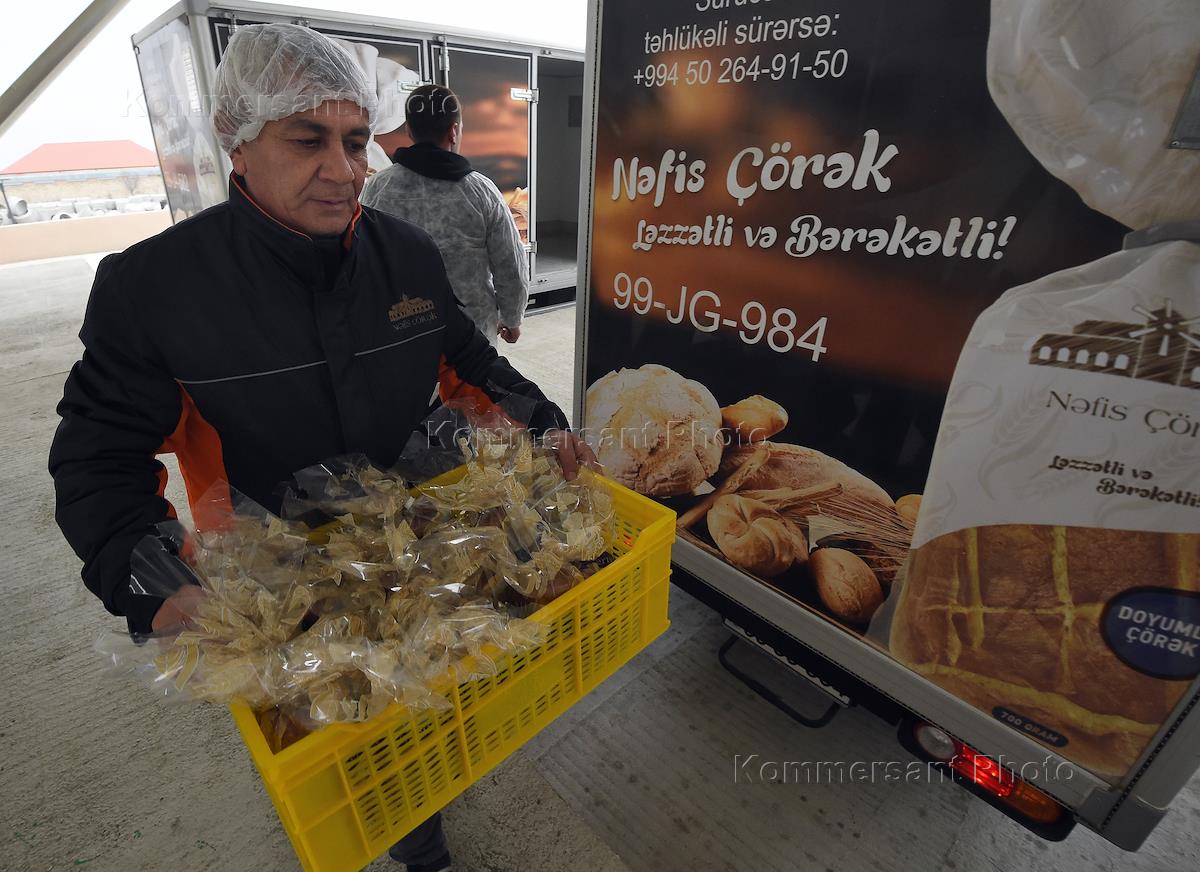 Работники во время погрузки готовой продукции на хлебозаводе в городе Шамкир.
