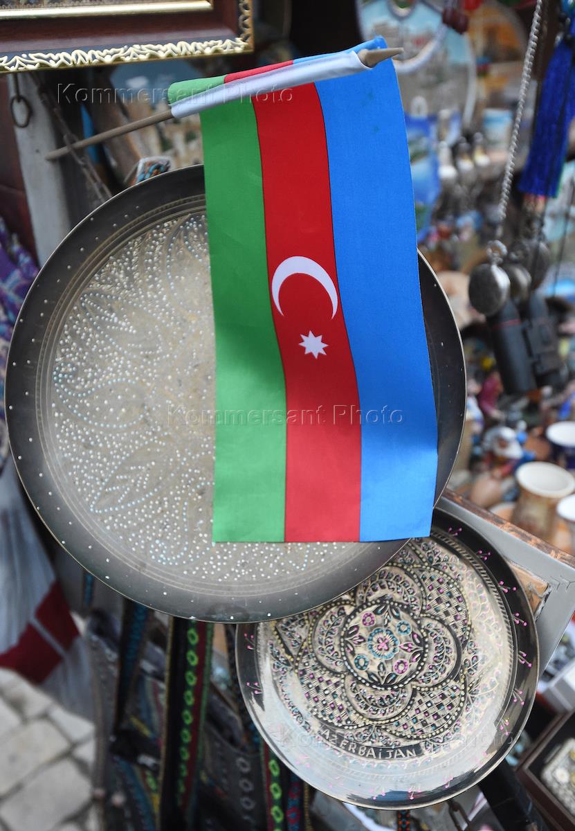 Жанровая фотография. Уличная торговля сувенирами. Флаг Азербайджана.