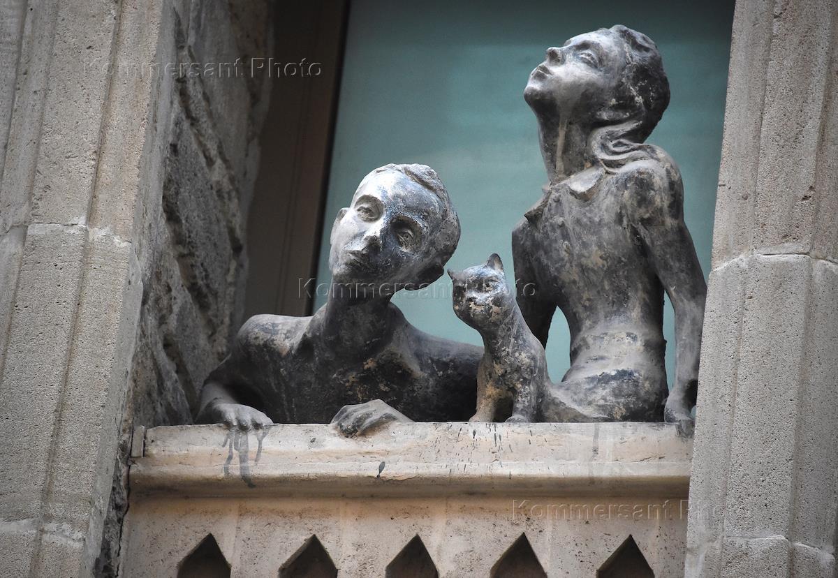 Жанровая фотография. Скульптурная группа мужчина, женщина и коша.