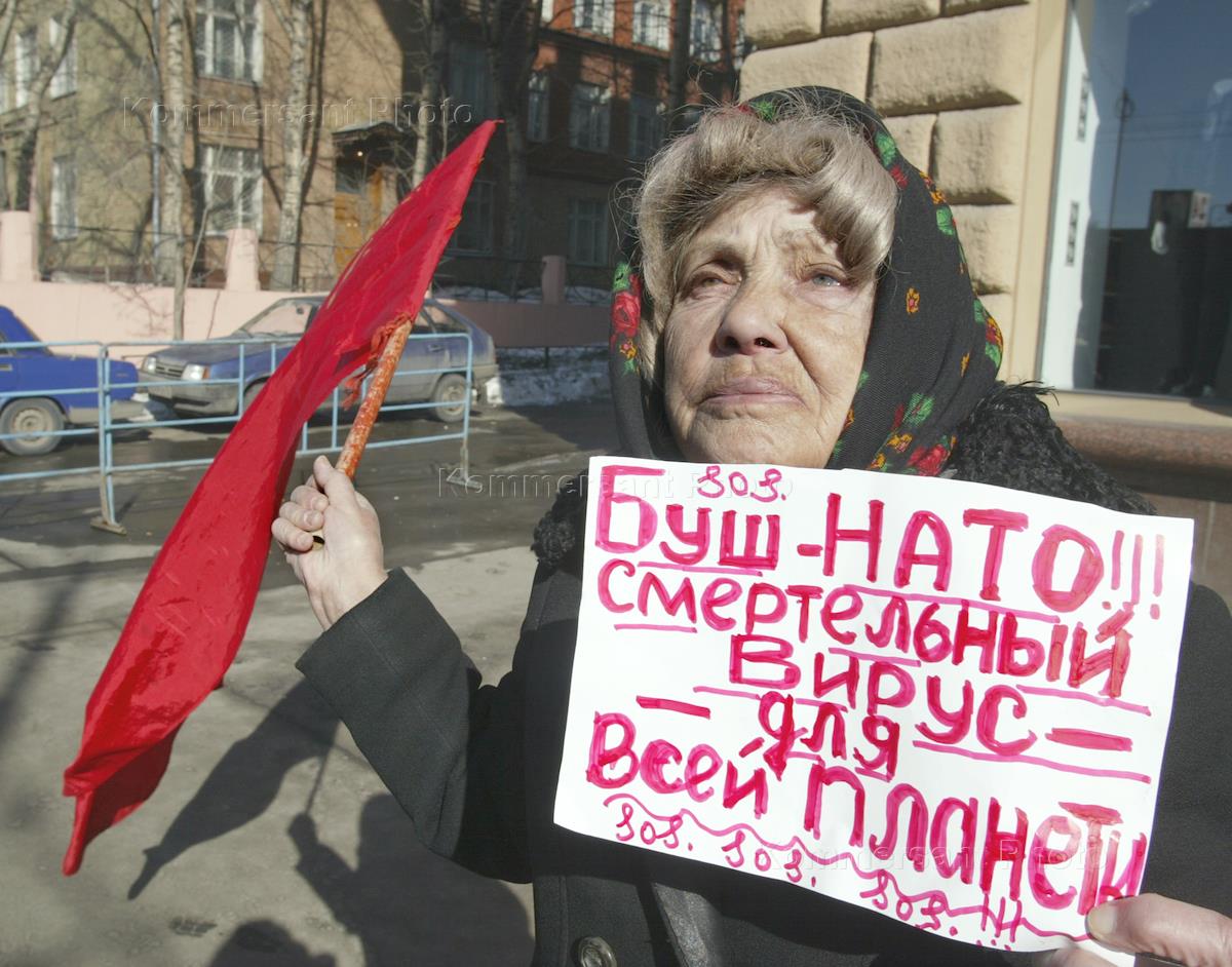 An elderly Communist sympathiser takes part in an antiwar rally staged in front of the US Embassy in Moscow.