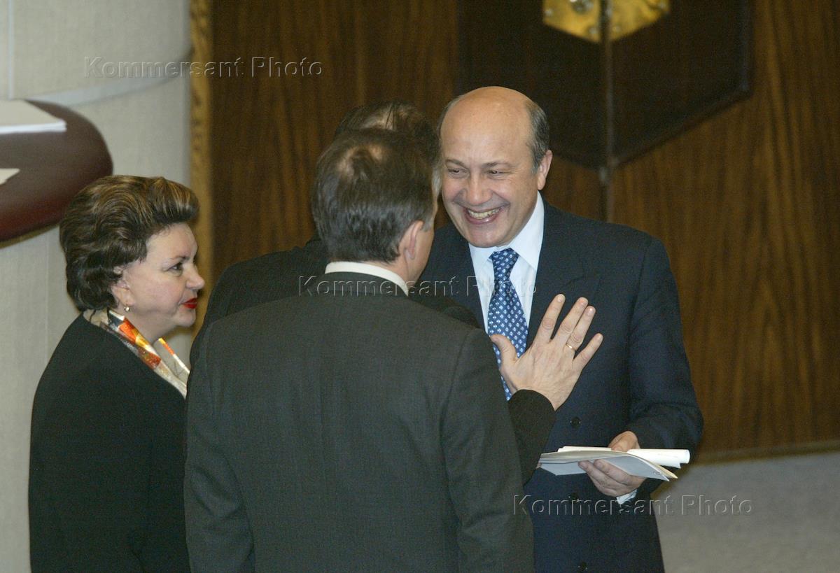 Член депутатской группы "Регионы России" (Союз независимых депутатов), заместитель Председателя Государственной Думы России Артур Чилингаров (слева), председатель Комитета Государственной Думы России по международным делам Дмитрий Рогозин (в центре) и первый заместитель председателя Государственной Думы России Любовь Слиска (справа) на очередном пленарном думском заседании.