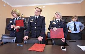 Полковник внутренней службы калужского УМВД, председатель женсовета калужской полиции Татьяна Осмоловская (справа) и члены женсовета на внеочередном заседании женсовета.