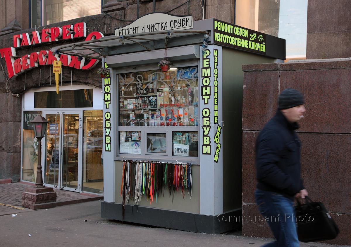 Виды Москвы. Палатка ремонта и чистки обуви на Тверской улице.