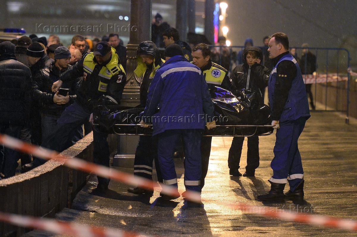 Сотрудники правоохранительных органов на месте убийства сопредседателя политической партии "РПР-ПАРНАС" Бориса Немцова, который был застрелен в ночь с пятницы на субботу на Большом Москворецком мосту.
