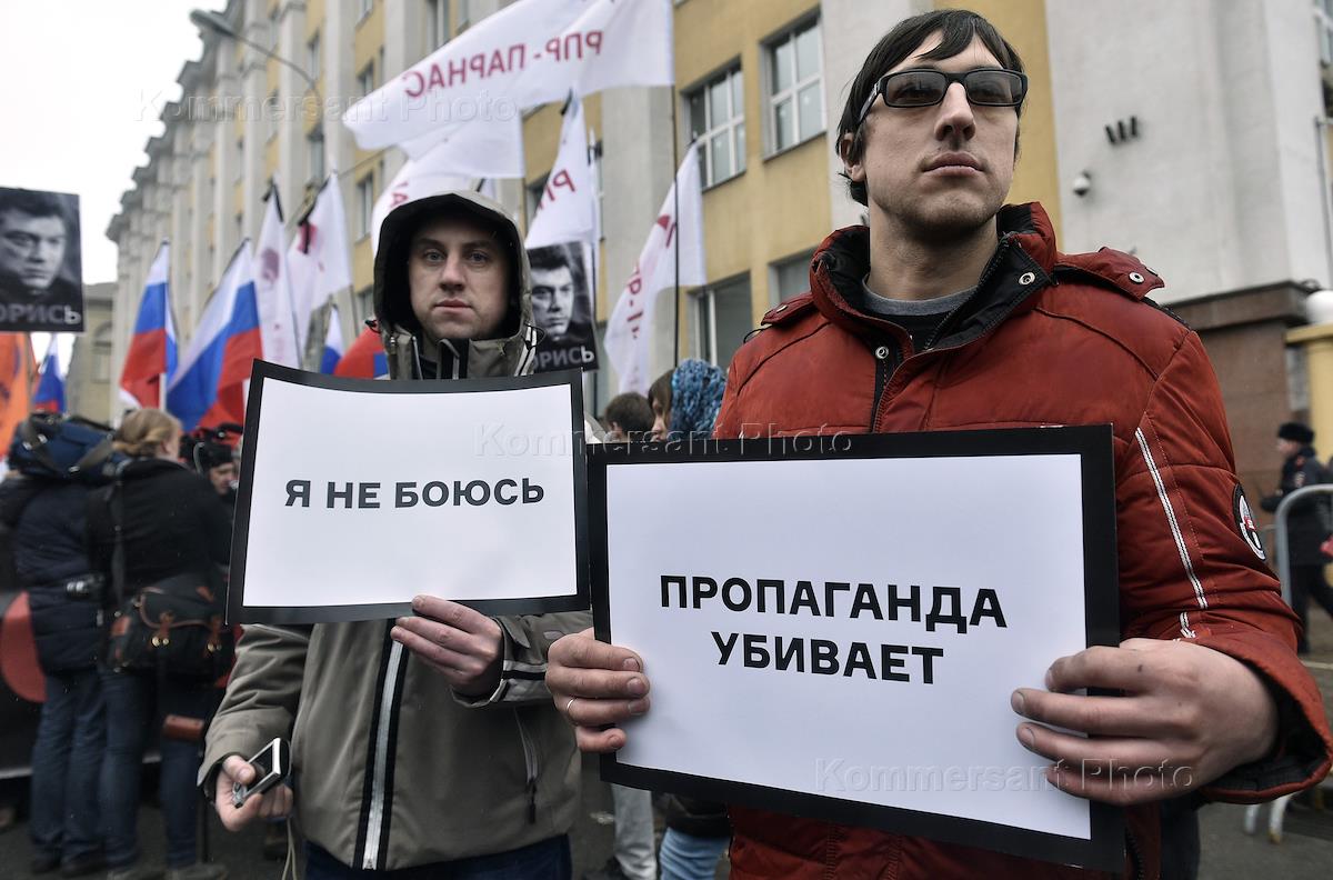 Funeral march in remembrance of co-chairman of political party RPR-Parnas (Republican Party of Russia – People's Freedom Party) Boris Nemtsov, who was shot in Friday night at Bolshoy Moskvoretsky Bridge. Participants of the march went from metro station 'Kitay-gorod' to Bolshoy Moskvoretsky Bridge.