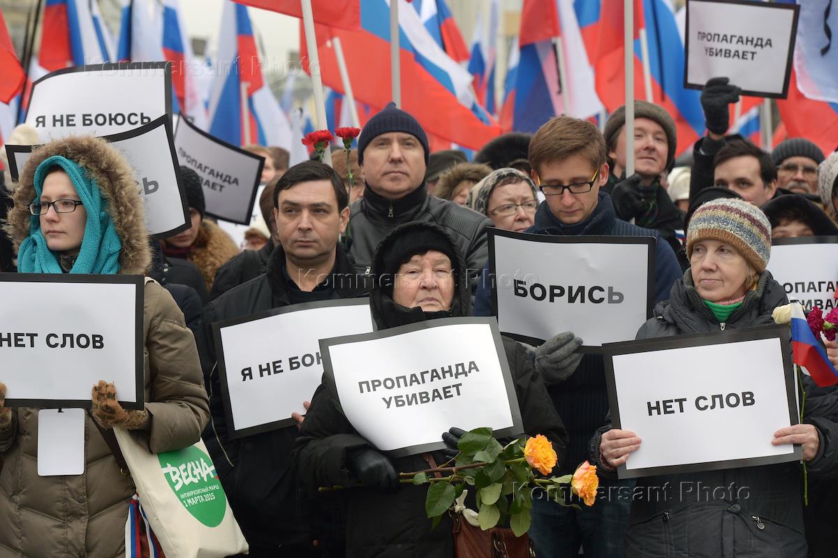 Funeral march in remembrance of co-chairman of political party RPR-Parnas (Republican Party of Russia – People's Freedom Party) Boris Nemtsov, who was shot in Friday night at Bolshoy Moskvoretsky Bridge. Participants of the march went from metro station 'Kitay-gorod' to Bolshoy Moskvoretsky Bridge.