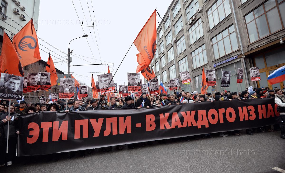 Траурный марш в память о сопредседателе политической партии "РПР-ПАРНАС" Борисе Немцове, который был застрелен в ночь с пятницы на субботу на Большом Москворецком мосту. Участники марша прошли от метро "Китай-город" до Большого Москворецкого моста.