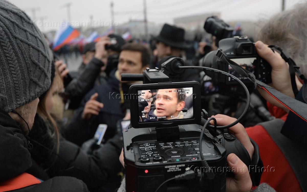 Траурный марш в память о сопредседателе политической партии "РПР-ПАРНАС" Борисе Немцове, который был застрелен в ночь с пятницы на субботу на Большом Москворецком мосту. Участники марша прошли от метро "Китай-город" до Большого Москворецкого моста. Член бюро движения "Солидарность" Илья Яшин во время марша.