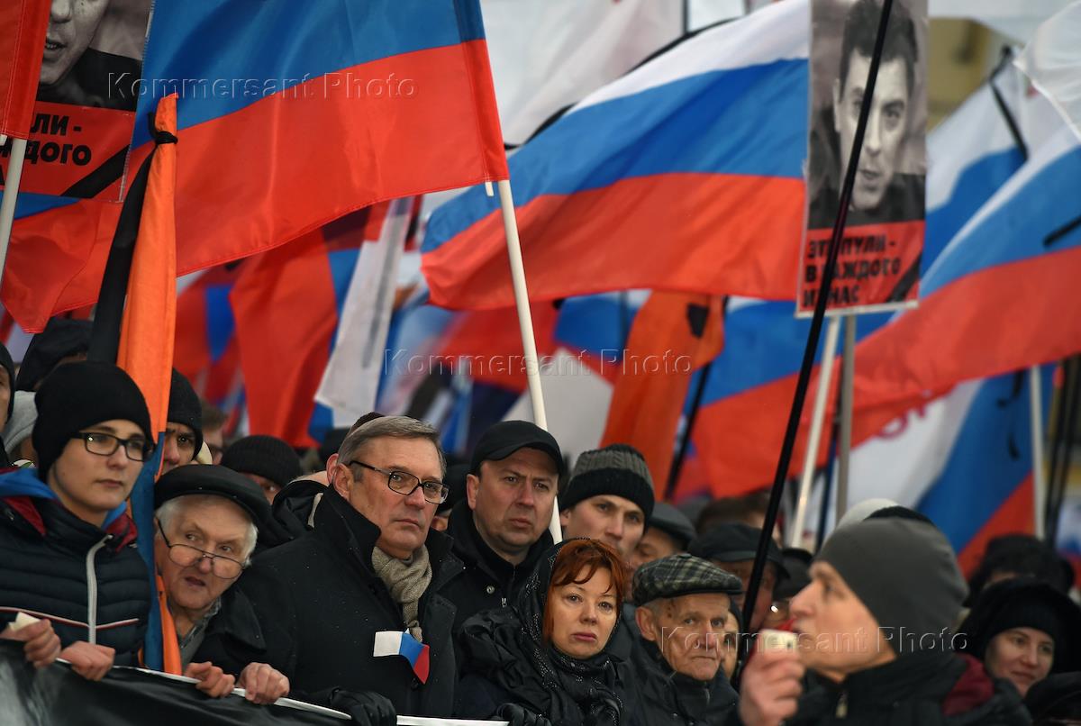 Председатель Российского народно-демократического союза Михаил Касьянов (треитй слева) с супругой Ириной (в центре) во время траурного марша в память о сопредседателе политической партии "РПР-ПАРНАС" Борисе Немцове, который был застрелен в ночь с пятницы на субботу на Большом Москворецком мосту. Участники марша прошли от метро "Китай-город" до Большого Москворецкого моста.