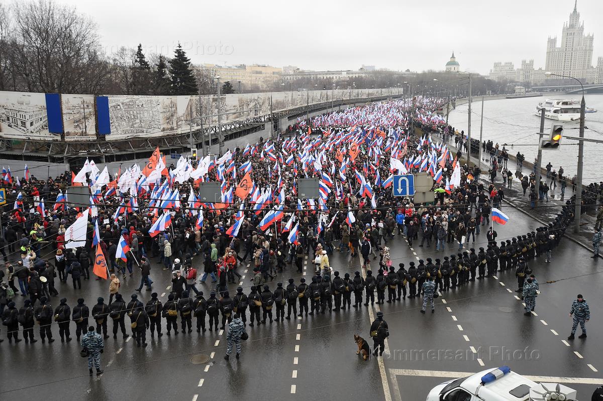 Траурный марш в память о сопредседателе политической партии "РПР-ПАРНАС" Борисе Немцове, который был застрелен в ночь с пятницы на субботу на Большом Москворецком мосту. Участники марша прошли от метро "Китай-город" до Большого Москворецкого моста. Сотрудники полиции в оцеплении во время марша.