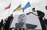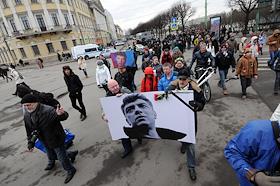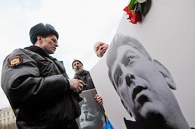 Траурный марш в память о сопредседателе политической партии "РПР-ПАРНАС" Борисе Немцове, который был застрелен в ночь с пятницы на субботу на Большом Москворецком мосту в Москве. Участники марша прошли от станции метро "Горьковская" до Марсова поля. Надпись на плакате: "Немцов борется в России со злом насмерть!"
