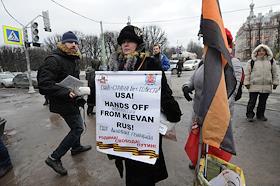 Траурный марш в память о сопредседателе политической партии "РПР-ПАРНАС" Борисе Немцове, который был застрелен в ночь с пятницы на субботу на Большом Москворецком мосту в Москве. Участники марша прошли от станции метро "Горьковская" до Марсова поля. дженщина стоит с плакатом "США - страна без совети! Родина! Свобода! Путин!".