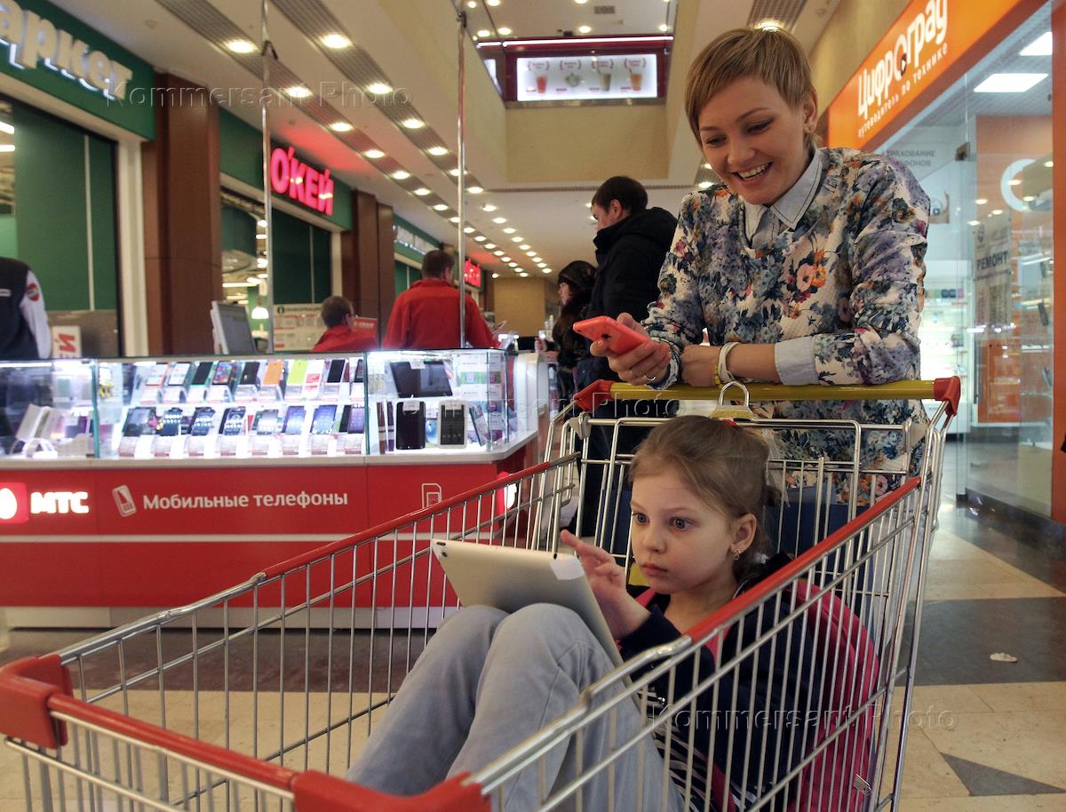 Жанровая фотография. Девушка с мобильном телефоном и девочка с планшетным компьютеров в тележке в торговом центре "Аура".