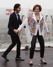 Актер Дев Патель (слева) и актриса Сигурни Уивер (справа) во время фотографирования после пресс-конференции, посвященной фильму "Робот по имени Чаппи" режиссера Нила Бломкампа в отеле The Ritz Carlton Moscow. Дева Пателя (Dev Patel) в отеле The Ritz Carlton Moscow.