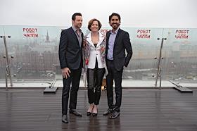Слева направо: актеры Хью Джексман, Сигурни Уивер и Дев Патель во время фотографирования после пресс-конференции, посвященной фильму "Робот по имени Чаппи" режиссера Нила Бломкампа в отеле The Ritz Carlton Moscow. Дева Пателя (Dev Patel) в отеле The Ritz Carlton Moscow.