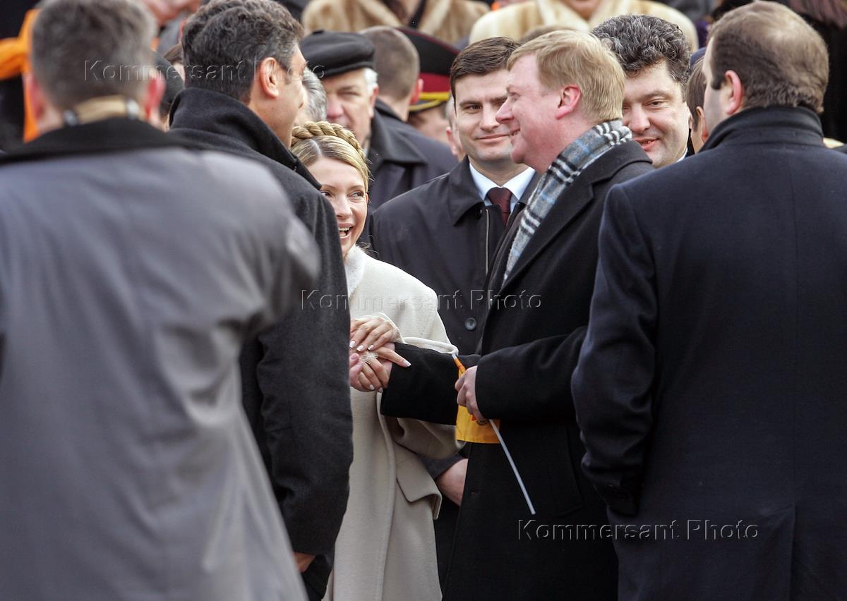 Член политического совета партии "Союз правых сил" Борис Немцов (слева), представитель оппозиции Украины Юлия Тимошенко (в цетре) и председатель правления РАО "ЕЭС России" Анатолий Чубайс (второй справа) во время церемонии инаугурации новоизбранного президента Украины Виктора Ющенко.