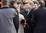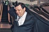 Руководитель "Альфа - банка" Михаил Фридман одевается после заседания правления Российского союза промышленников и предпринимателей в "Президент - отеле".