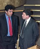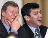 Председатель правления РАО "ЕЭС России" Анатолий Чубайс (слева) и лидер движения "Союз Правых Сил" (СПС) Борис Немцов (справа) на съезде движения СПС, где Союз был преобразован из общественно-политической организации в политическую партию.