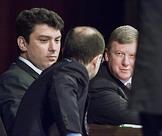 Слева направо: член совета Государственной думы России Борис Немцов, представитель президента России по Приволжскому федеральному округу Сергей Кириенко и председатель правления РАО "ЕЭС России" Анатолий Чубайс на учредительном съезде вновь образующей партии "Союз Правых Сил", проходившем в помещении Академии наук России. Лидером объединенной партии был избран Борис Немцов.