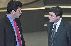Политики Борис Немцов (слева) и Григорий Явлинский (справа) в Государственной думы России.