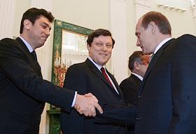 Политики Борис Немцов (слева), Григорий Явлинский (в центре) и президент России Владимир Путин (справа) во время встречи в Кремле.