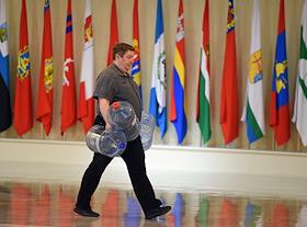 Жанровая фотография. Сотрудник технических служб Совета Федерации России с пустыми бутылями для кулера.