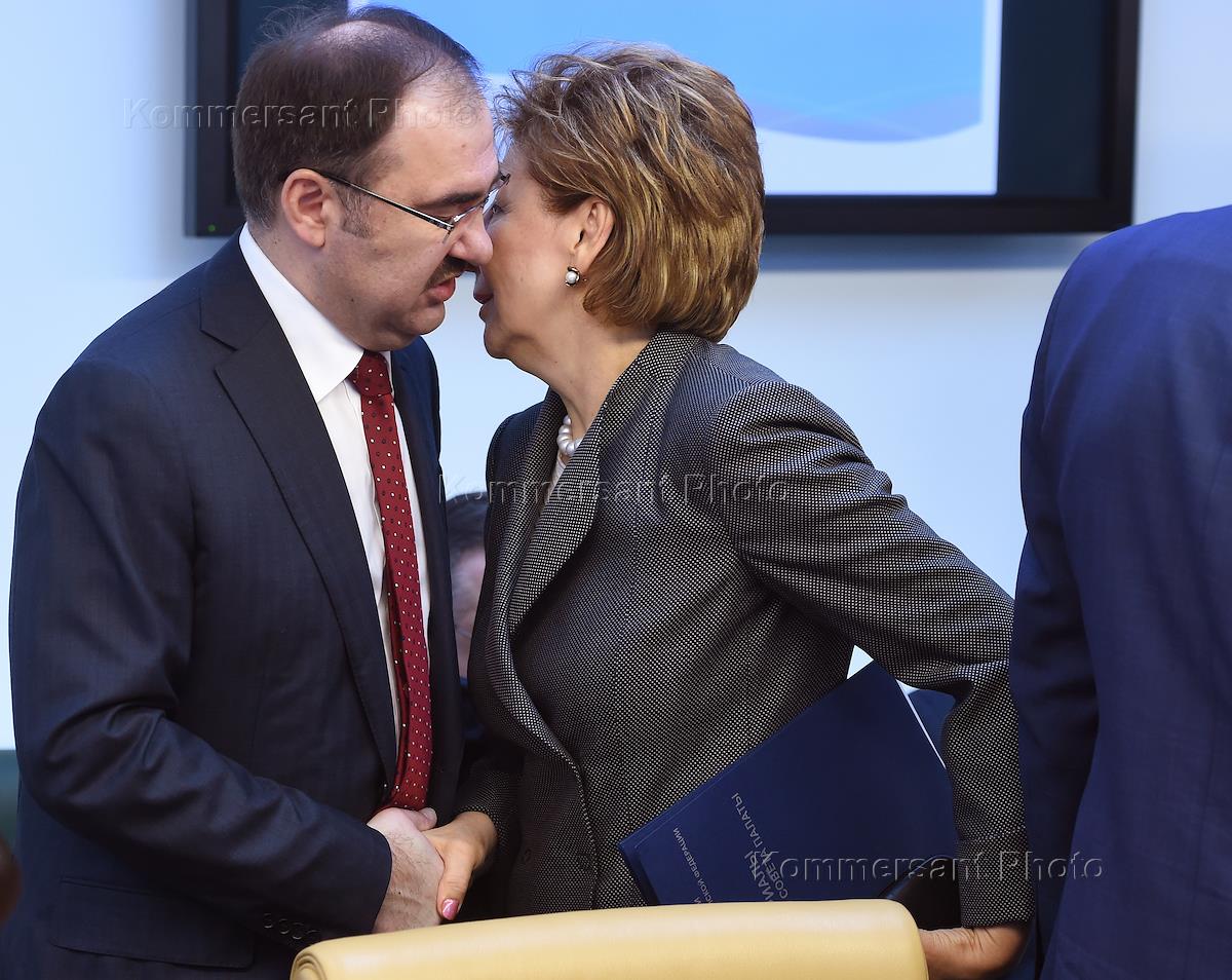 Председатель правления Пенсионного фонда России Антон Дроздов (слева) и заместитель председателя Совета Федерации России Галина Карелова (справа) во время расширенного заседания комитета Совета федерации по социальной политике.