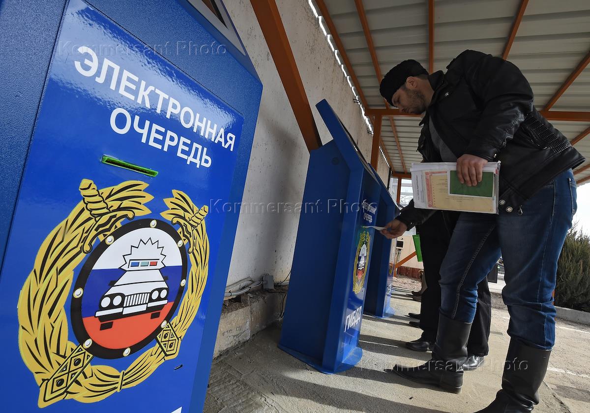 Министерство внутренних дел (МВД) по Республике Крым. Люди во время записи электронной очереди через терминал у здания МВД.