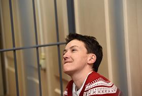Украинская военнослужащая Надежда Савченко, обвиняемая в причастности к убийству российских журналистов под Луганском, после заседания Басманного районного суда. На заседании была рассмотрена жалоба Надежды Савченко на отказ следователя отпустить ее на заседание ПАСЕ из СИЗО.