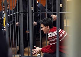 Украинская военнослужащая Надежда Савченко, обвиняемая в причастности к убийству российских журналистов под Луганском, во время заседания Басманного районного суда. На заседании была рассмотрена жалоба Надежды Савченко на отказ следователя отпустить ее на заседание ПАСЕ из СИЗО.