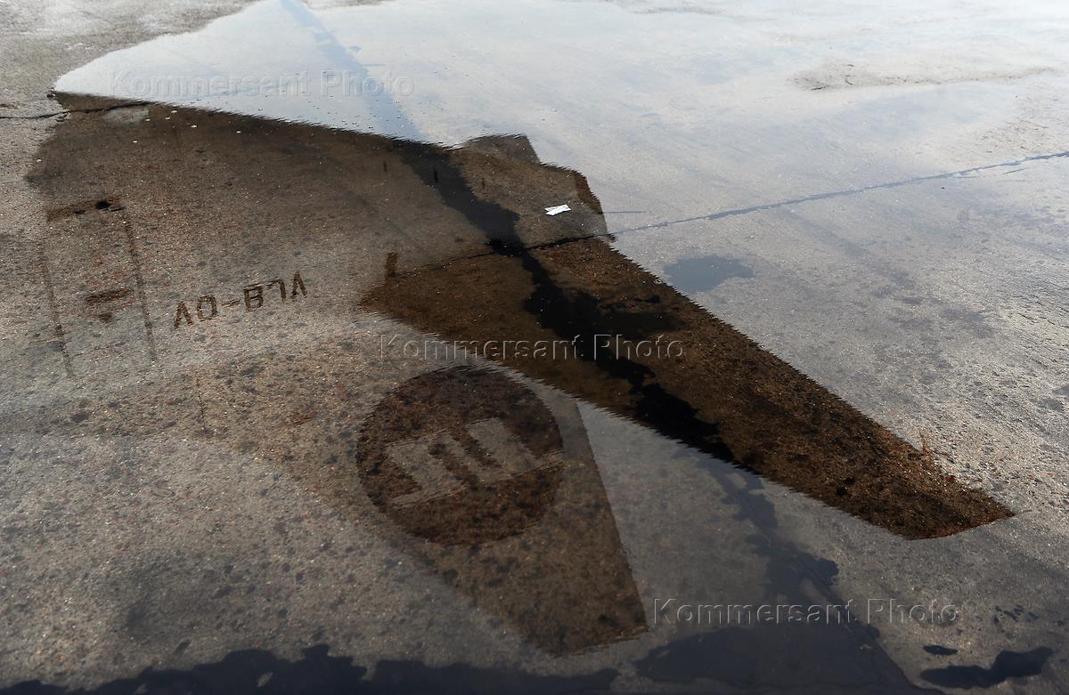 Жанровая фотография. Самолет авиакомпании "Ютейр" на летном поле аэропорта Внуково. Обработка корпуса самолета противообледенительным составом.