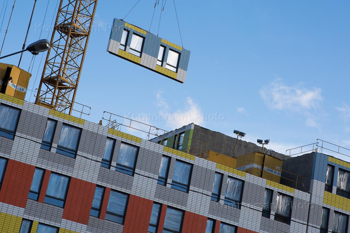 Жанровая фотография. Строительные краны над строящимися многоэтажными домами.