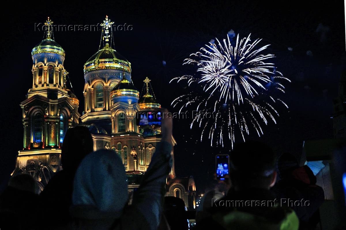 Празднование Дня Победы. Салют в честь 76-й годовщины Победы в Великой Отечественной войне на фоне Собора Воскресения Христова - главного храма Вооружённых Сил России в военно-патриотическом парке культуры и отдыха Вооружённых Сил России "Патриот".