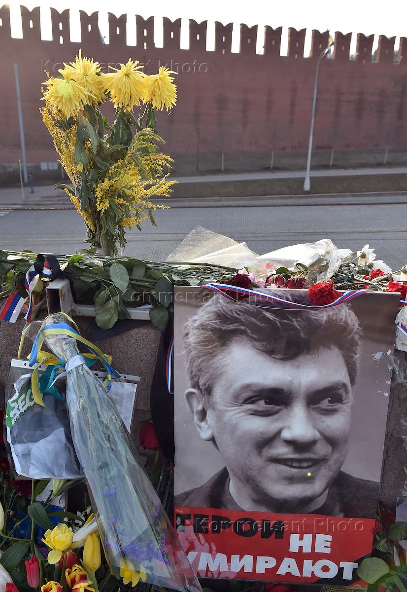 Цветы и фотография в память о сопредседателе политической партии "РПР-ПАРНАС" Борисе Немцове, который был застрелен в ночь с пятницы на субботу на Большом Москворецком мосту.