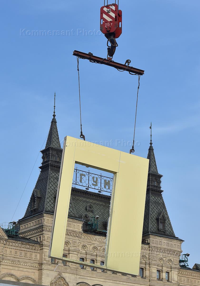 Жанровая фотография. Дверной проем во время установки краном на фоне здания ГУМа.