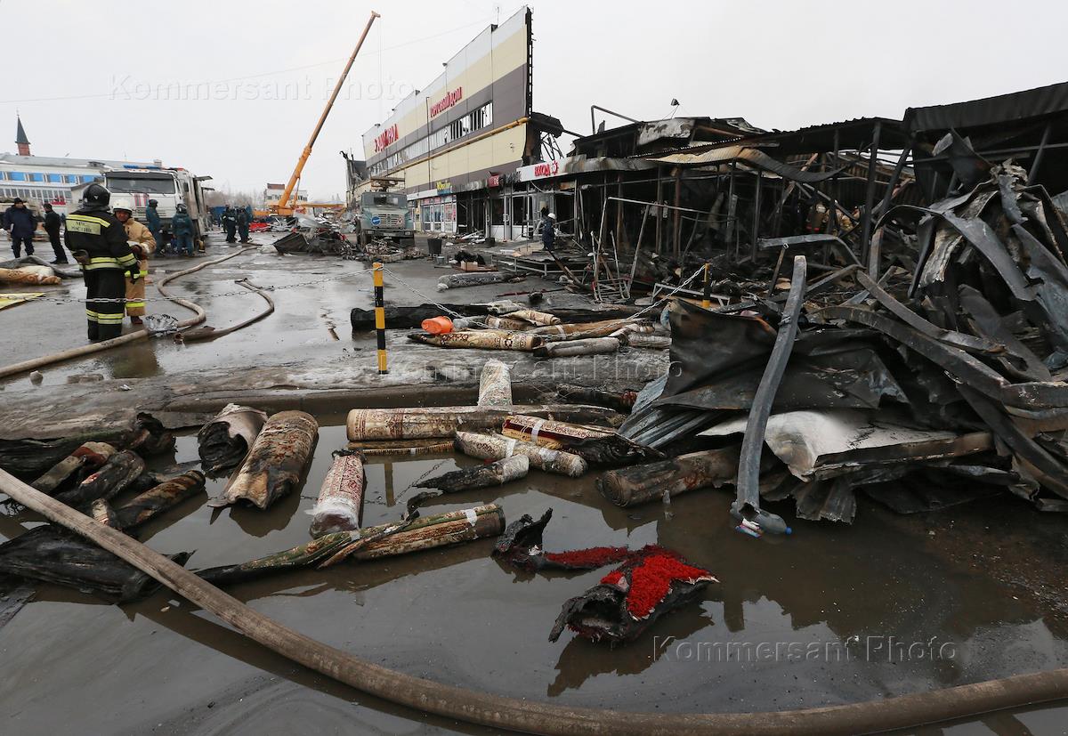 Сотрудники пожарной службы МЧС во время расчистки завалов после пожара в Торговом центре "Адмирал".