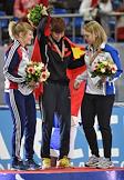 Чемпионат мира по шорт-треку. Призеры забега на 500 метров среди женщин, слева направо: Элиза Кристи (Великобритания) - серебряная медаль, Фань Кэсинь (Китай) - золотая медаль и Арианна Фонтана (Италия) - бронзовая медаль во время церемонии награждения в ДС "Крылатское".