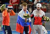 Чемпионат мира по шорт-треку. Призеры забега на 1500 метров среди мужчин, слева направо: Шинки Кнегт (Нидерланды) - серебряная медаль, Семен Елистратов (Россия) - золотая медаль и Шарль Амлен (Канада) - бронзовая медаль во время церемонии награждения в ДС "Крылатское".