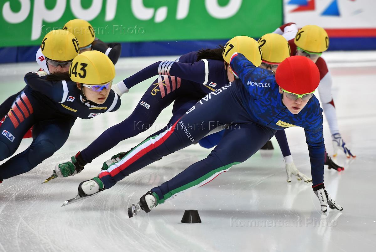 Чемпионат мира по шорт-треку. Корейская спортсменка Чхои Минджон (слева) и итальянская спортсменка Арианна Фонтана (в центре) во время забега суперфинала на 3000 метров среди женщин в ДС "Крылатское".
