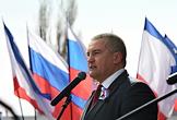 Председатель Совета министров Республики Крым Сергей Аксенов во время митинга в честь годовщины проведения референдума о статусе Крыма у здания Государственного совета РК в Симферополе.